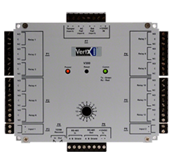 Giao diện điều khiển đầu ra V300 chứa 12 rơ le Form-C chốt, có thể kết nối tối đa 12 thiết bị có thể điều khiển bằng các tiếp điểm đóng đơn giản, chẳng hạn như đầu vào logic cho thiết bị xử lý, bảng điều khiển HVAC và thang máy, bộ chuyển mạch CCTV, v.v. Tải vượt quá 2 A @ 30 VDC phải được điều khiển thông qua các rơ le xen kẽ.